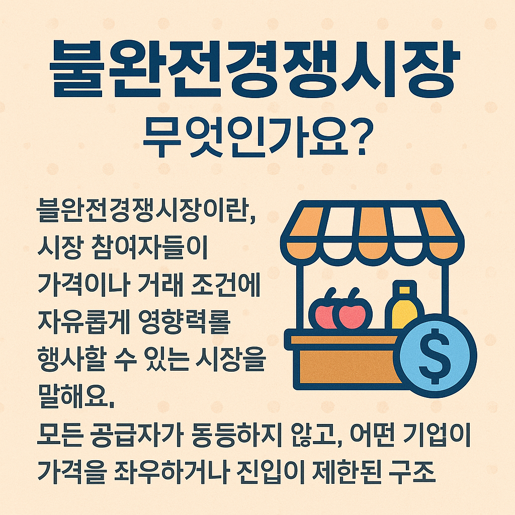 즉, 모든 공급자가 동등하지 않고, 어떤 기업이 가격을 좌우하거나 진입이 제한된 구조를 가지면 불완전경쟁시장이라 할 수 있어요.