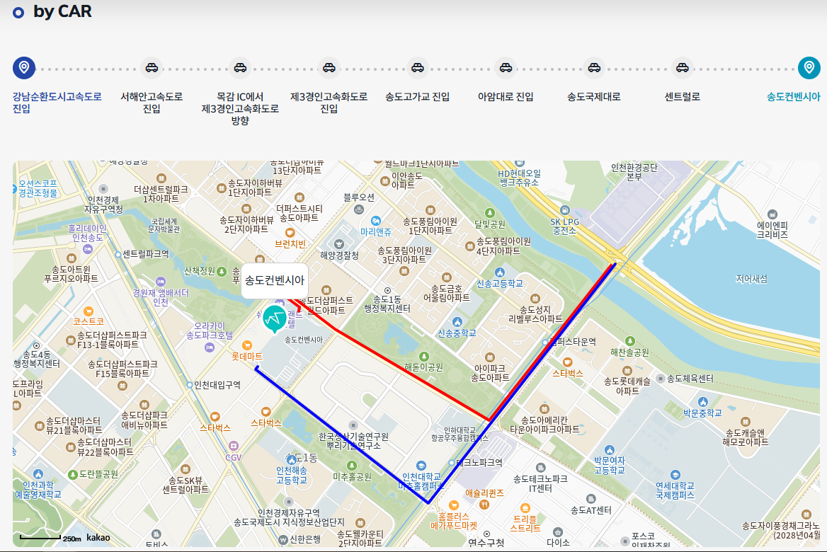 제2경인고속도로 ‘송도IC’ 또는 인천대교 ‘송도국제도시 방면’을 이용하면 혼잡 피해서 쉽게 접근할 수 있어요. 송도국제도시는 도로 폭이 넓고 주행이 쾌적한 편이에요.