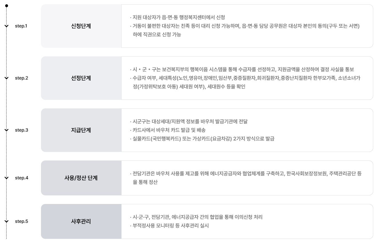 - 신청서 작성 및 제출 → 대상자 확인 후 바우처 지급
