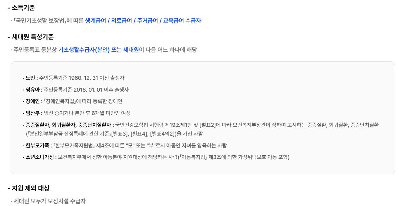 - 국민기초생활수급자 중 생계·의료급여 대상자