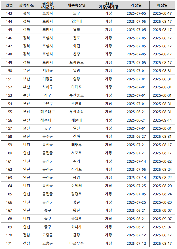 | 포항시 | 영일대, 도구, 칠포 등 | 2025-07-05 | 2025-08-17 |