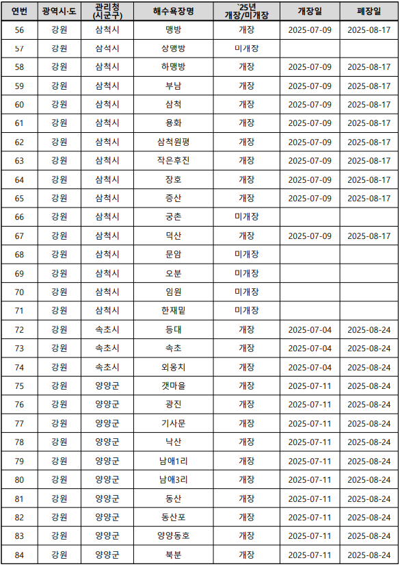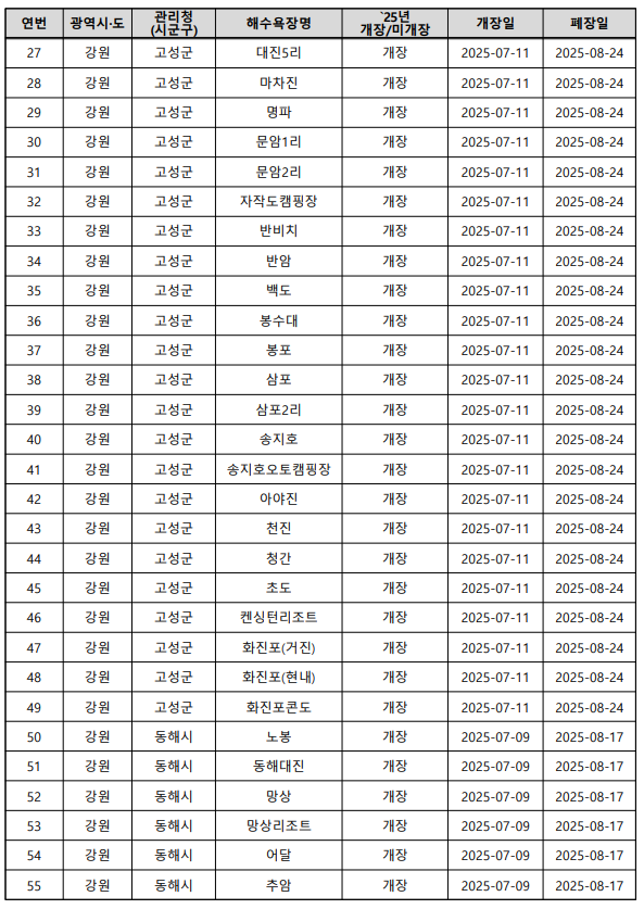 | 속초시 | 속초해변, 외옹치 등 | 2025-07-04 | 2025-08-24 |