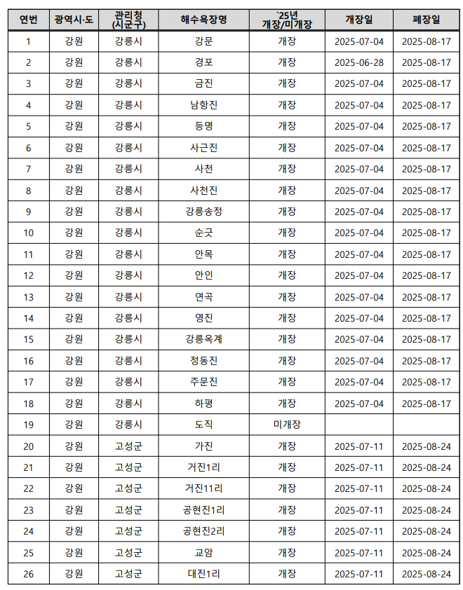 | 강릉시 | 경포, 정동진, 주문진 등 | 2025-07-04 | 2025-08-17 |
