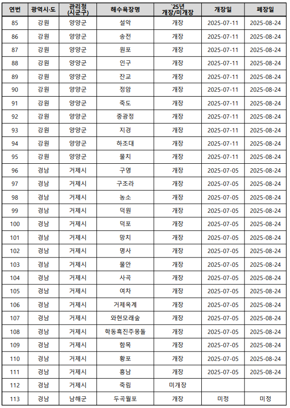 2025 전국 해수욕장 개장 일정 총정리(+개장일·폐장일·미개장 포함)