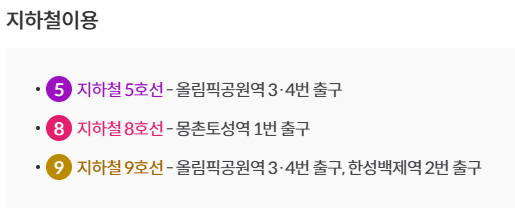 - 지하철: 5호선 올림픽공원역 3번 출구 도보 5분